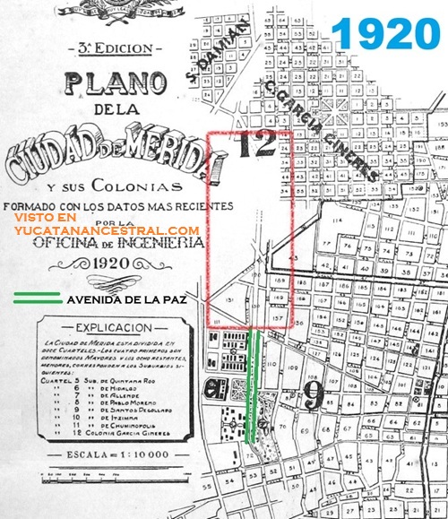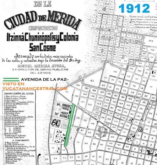 El primer plano corresponde a 1912. Ya existía la Avenida de la Paz, que iba de la esquina de la calle 59-A, hasta poco antes de la calle 63. Actualmente en ese tramo no existe la calle 63, pero sí hacia el poniente, a un costado, atrás del actual Centro Estatal de Bellas Artes. Lo que sería la Avenida Itzáes, aún no está trazado.