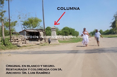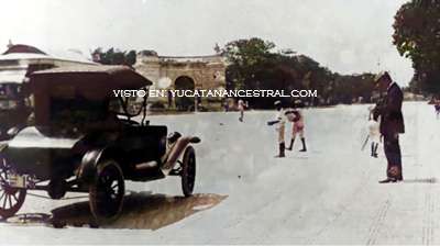 Imagen de 1925 ca. donde se aprecia la Avenida de los Itzáes, una de las columnas conmemorativas y un humilde puesto de refrescos.