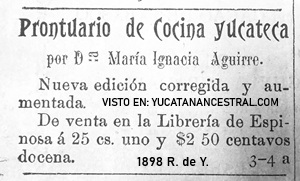 En la prensa de 1898 encontré este anuncio de la Librería de Espinosa, donde se ofrece una nueva edición corregida y aumentada del «Prontuario de Cocina Yucateca» de Doña María Ignacia Aguirre. Se vendía cada uno a 25 centavos y por docena a $2.50.